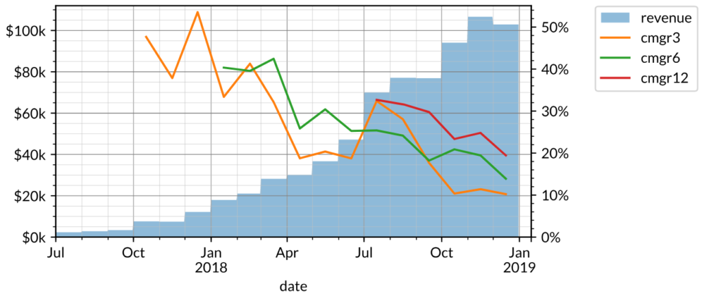 The first example is generated data for a fictional product whose monthly revenue is graphed below alongside three lines — CMGR3, CMGR6, and CMGR12 – that track the compound monthly growth rate of revenue for the trailing three, six, and twelve months respectively.