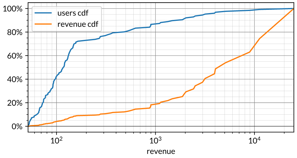 To begin, see below for a fabricated but nonetheless fairly typical distribution of revenue in a B2B business. The x-axis is revenue collected in a single month on a logarithmic scale and the y-axis is the cumulative percentage of customers on the blue line and revenue on the orange line. Let’s first focus on the blue line at the $4k revenue point on the x-axis. The blue line says that 80% of customers spent less than $4k. Conversely, the top quintile of customers spent more than $4k. The orange line above that same x-axis value says that 40% of revenue came from customers who spent less than $4k. Conversely, 60% of revenue came from customers who spent more than $4k. Said another way, “80/20” (i.e. the “Pareto principle”) for this business is “60/20”. This is fairly typical for an internet business. Technology “levels the playing field” in some sense and, as such, reduces the inequality in distributions of customers.