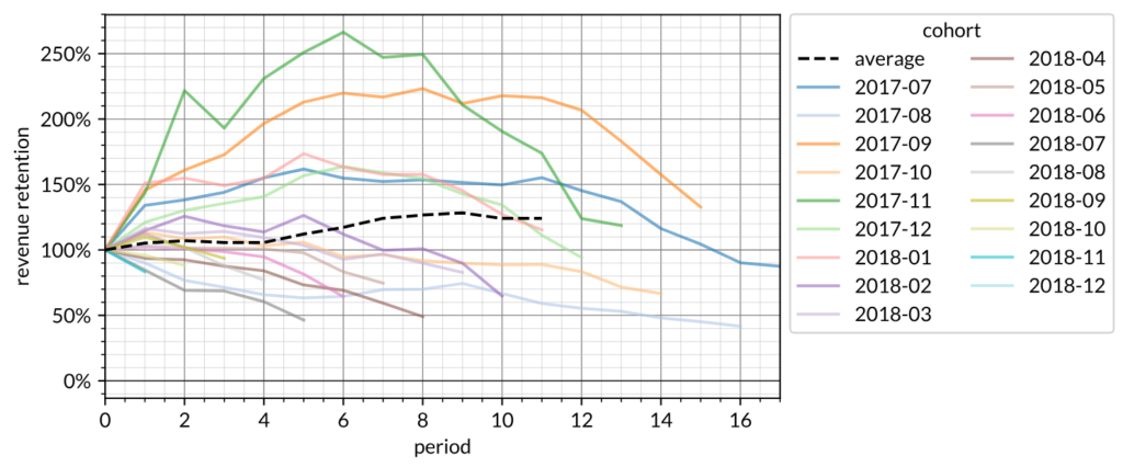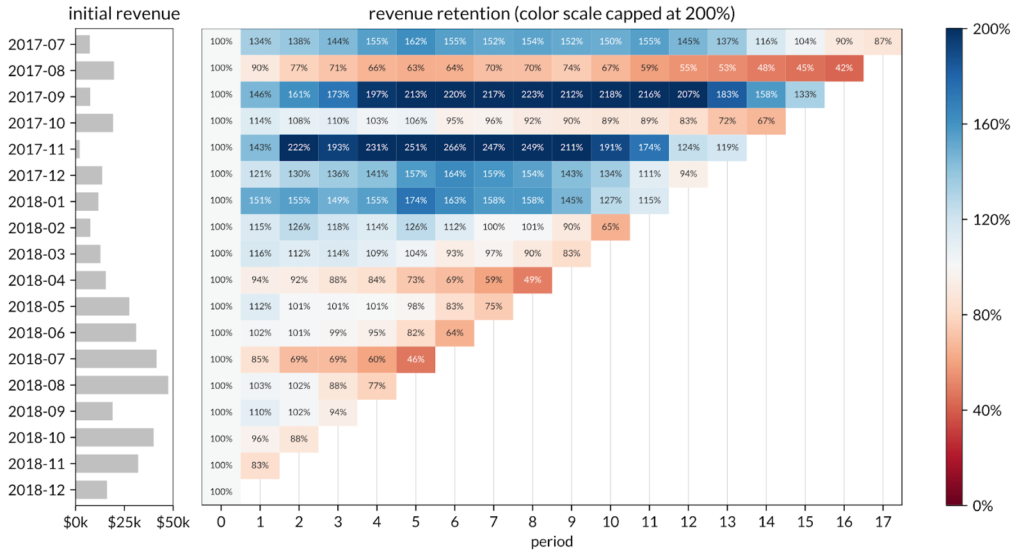 • Revenue retention: the percentage of a cohort’s initial activity that is retained at a fixed time period afterwards.