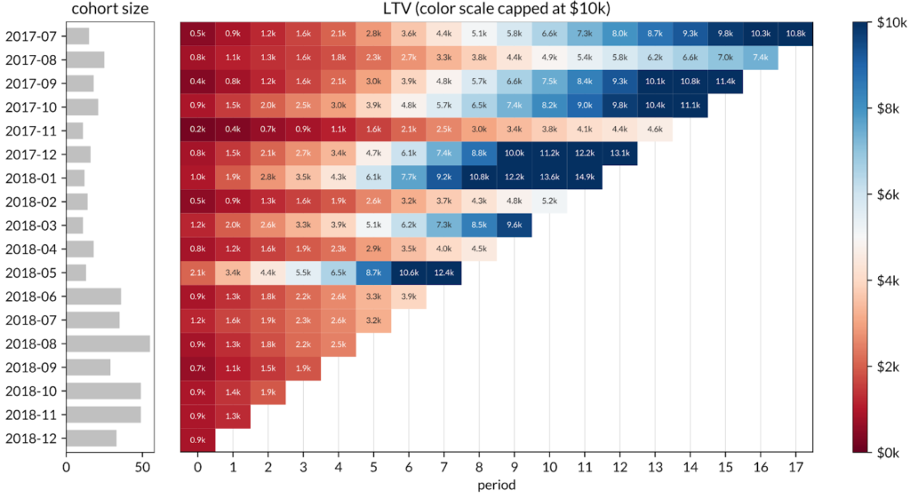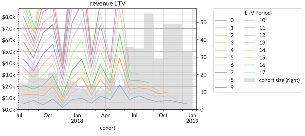 This graph allows us to observe differences among cohorts while holding cohort age constant. In the graph above, spikes in each line show that month’s cohort as having a higher LTV (in terms of cohort age) relative to customer cohorts before and afterwards. For example, from July 2017 to July 2018, the average customer LTV after 3 months (LTV Period = 3) increased from $1.2K to $1.8K; however, since July 2018 it has steadily decreased. The cohort size is included because it is common to see situations where cohort sizes are increasing while simultaneously shrinking LTVs. Acquiring a lot more customers isn’t necessarily great if you’re making so much less money on them that you end up in the same place or worse.