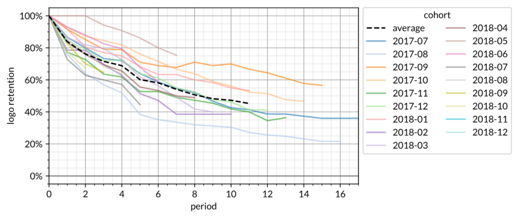 This next graph shows the cohort logo retention curves. The focus on this graph is whether logo retention has reached an asymptote at long duration. This particular example does not yet appear to show strong evidence of a flat asymptotic behavior although it may appear in the future as time passes.