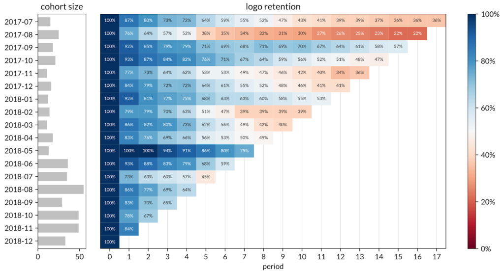 • Customer (logo) retention: the percentage of a cohort’s initial customers that is retained (i.e. still using/paying for the product) at a fixed time period afterwards.