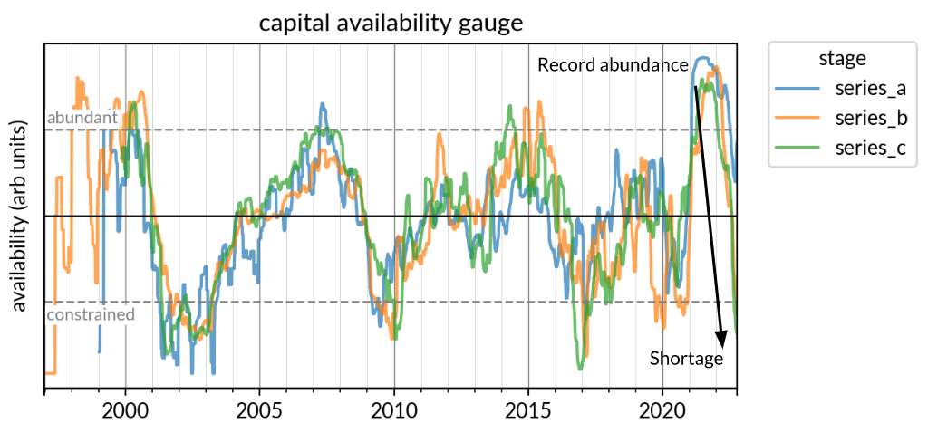 In order to answer the question of capital availability we measure two primary inputs. For the sake of illustration let us consider the Series B gauge.