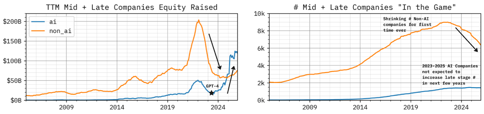 Since the 2023 VC Funding Shortage, available capital for Non-AI Mid- and Late-Stage startups in the US has fallen from $200B to $75B. Meanwhile, capital for Mid- and Late-Stage AI is more abundant than ever. The number of Non-AI Mid- and Late-Stage startups “In the Game,” or having fundraised in a 4-year period, has accordingly dropped by over 25%, a figure we expect only to increase.